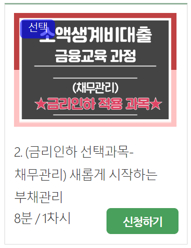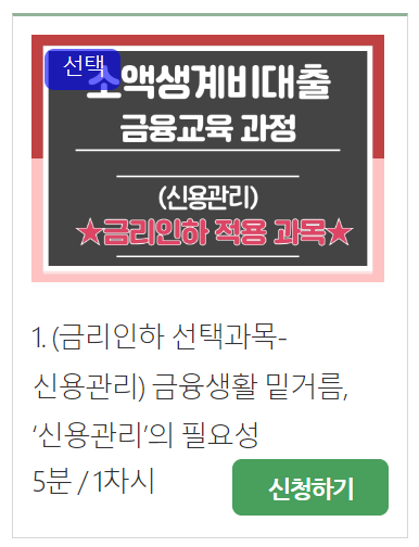 온라인 교육 > 대출이용자 교육 > 소액생계비대출 에서 5분 동영상을 시청하면 됩니다.