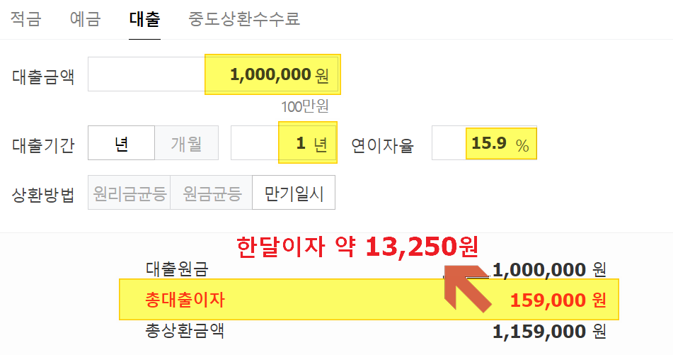 100만원 생계비대출, 연이자율 15.9%, 만기일시 상환 조건
