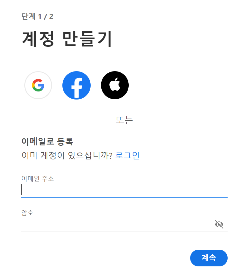 계정 만들기 과정에서 구글계정 gmail, 페이스북, 애플아이디로 로그인 연동이 되니 편한방법으로 선택하시면 됩니다.