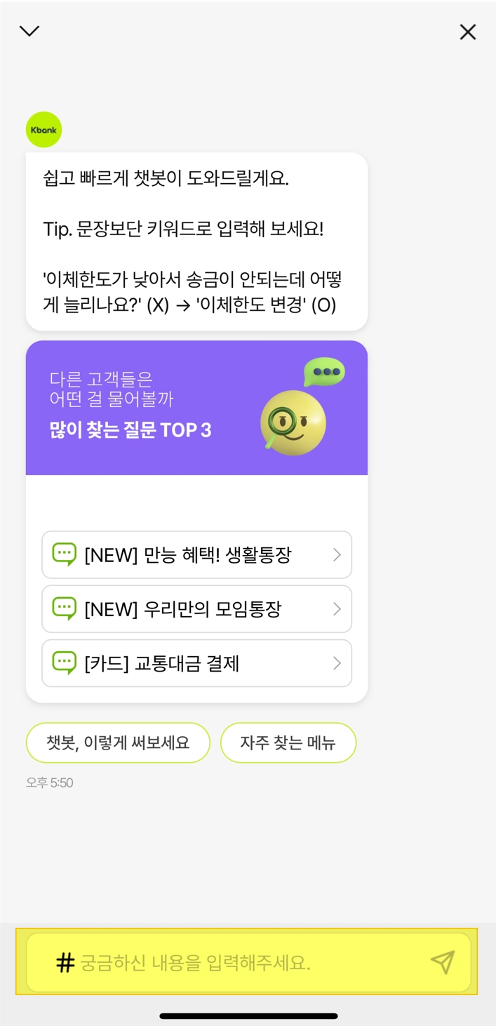 이제 케이뱅크 챗봇으로 연결됩니다.