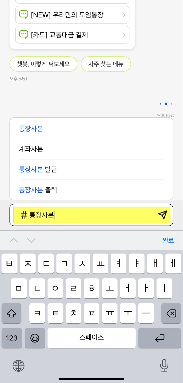 챗봇창에 명령어 검색으로 "통장사본" 을 입력해주세요.
